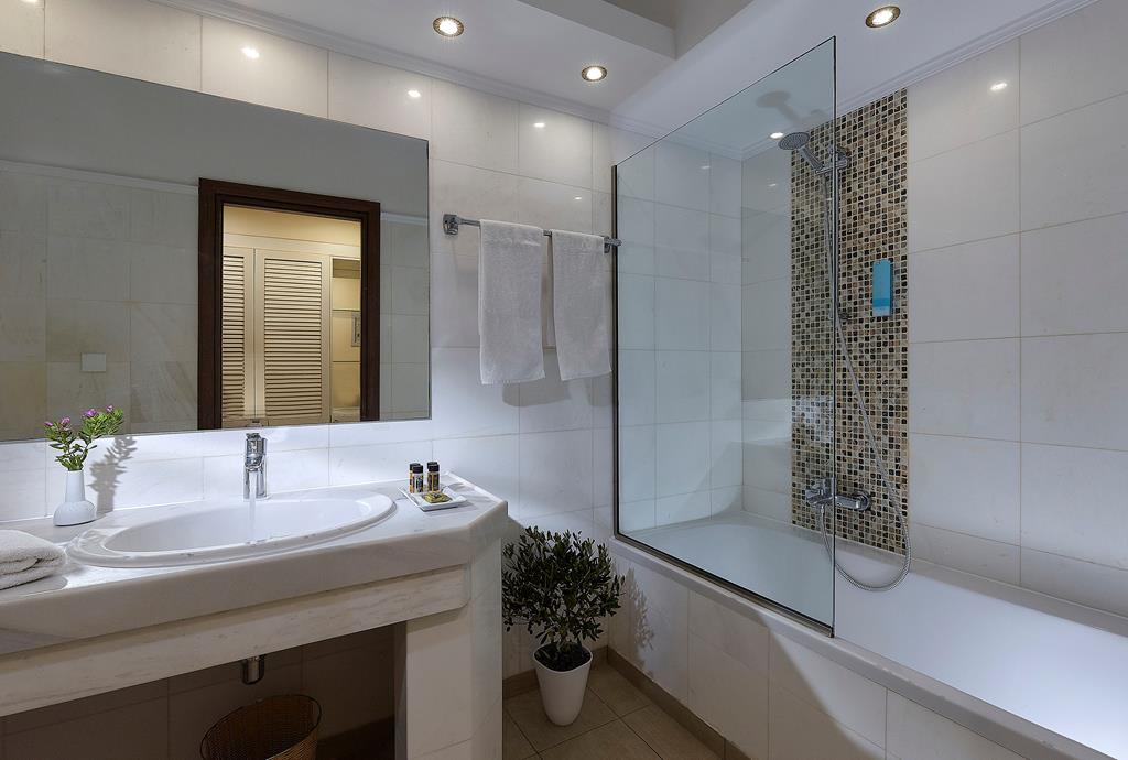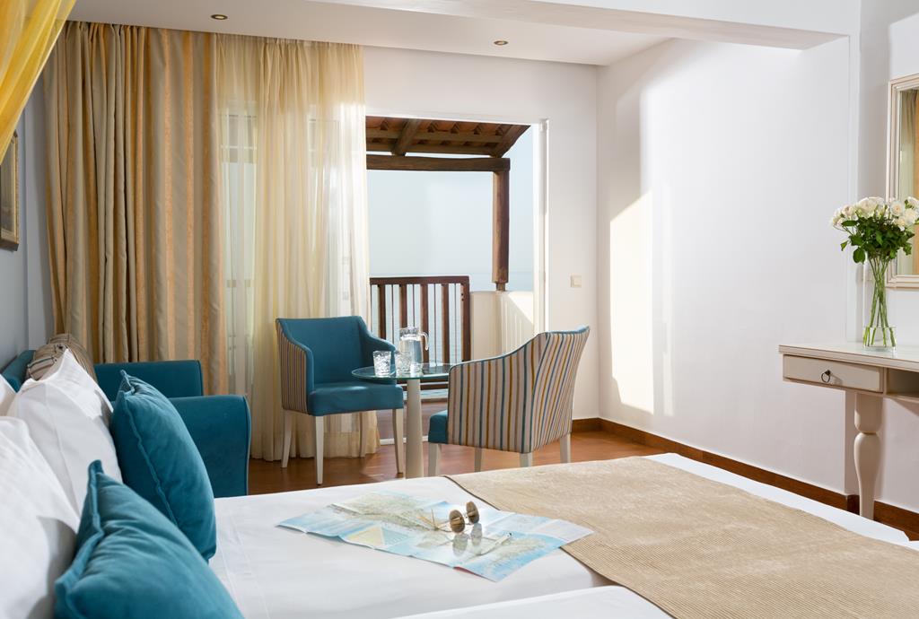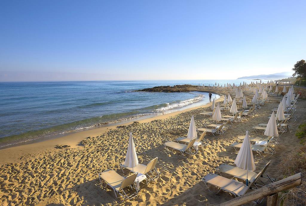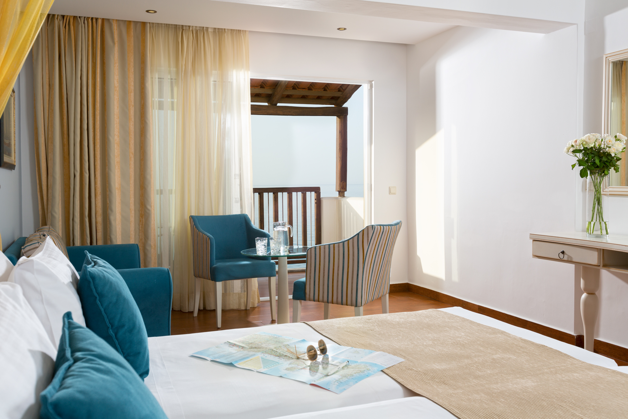 Die Zimmer im Erdgeschoss haben direkten Zugang zur Veranda und einem kleinen privaten Garten mit Sonnenliegen. Sie bieten entweder Gartenblick oder einen atemberaubenden Blick auf den Strand. Die Zimmer auf der oberen Etage verfügen über einen Balkon mit Gartenblick oder atemberaubender Aussicht auf den Strand und die Bucht von Stalis.